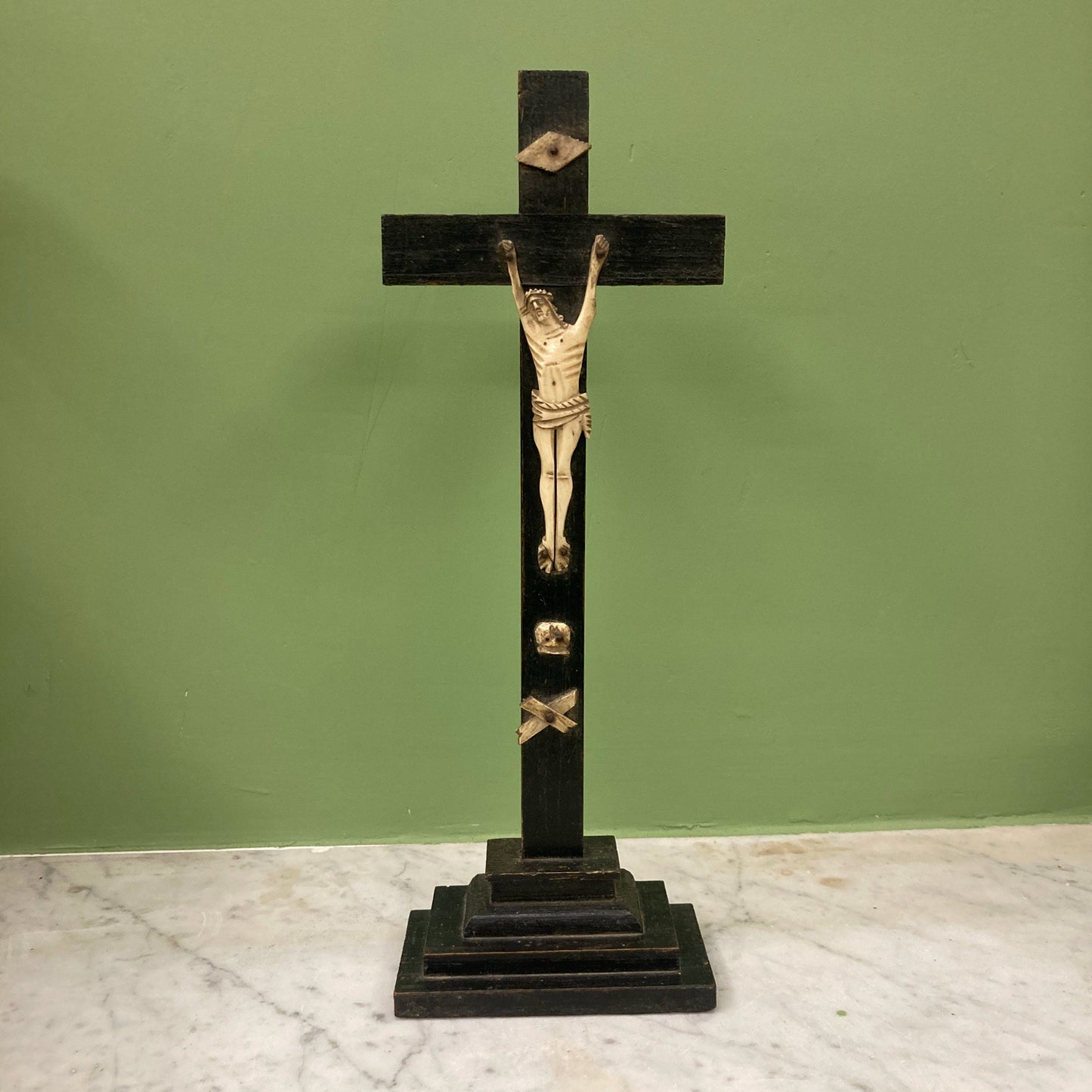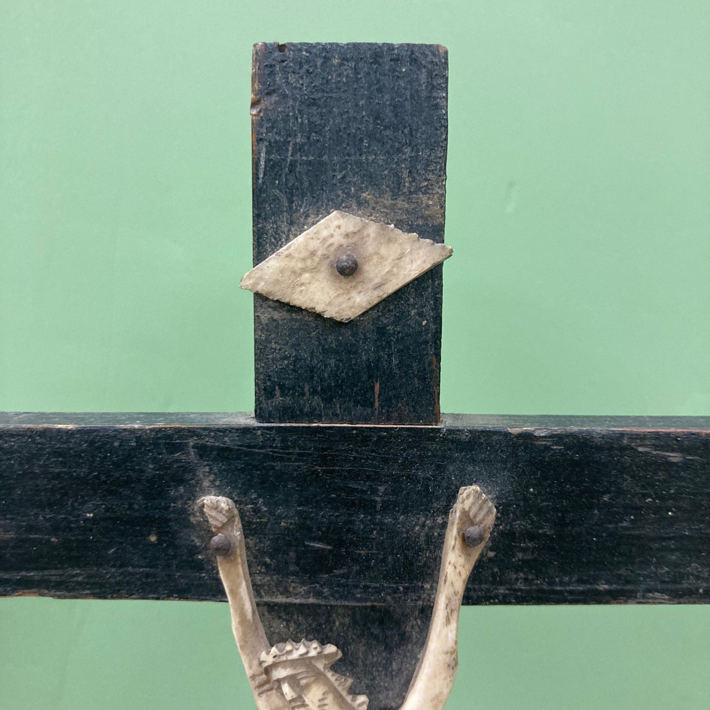 Antique Jansenist Christ in bone fixed on a blackened wooden cross.