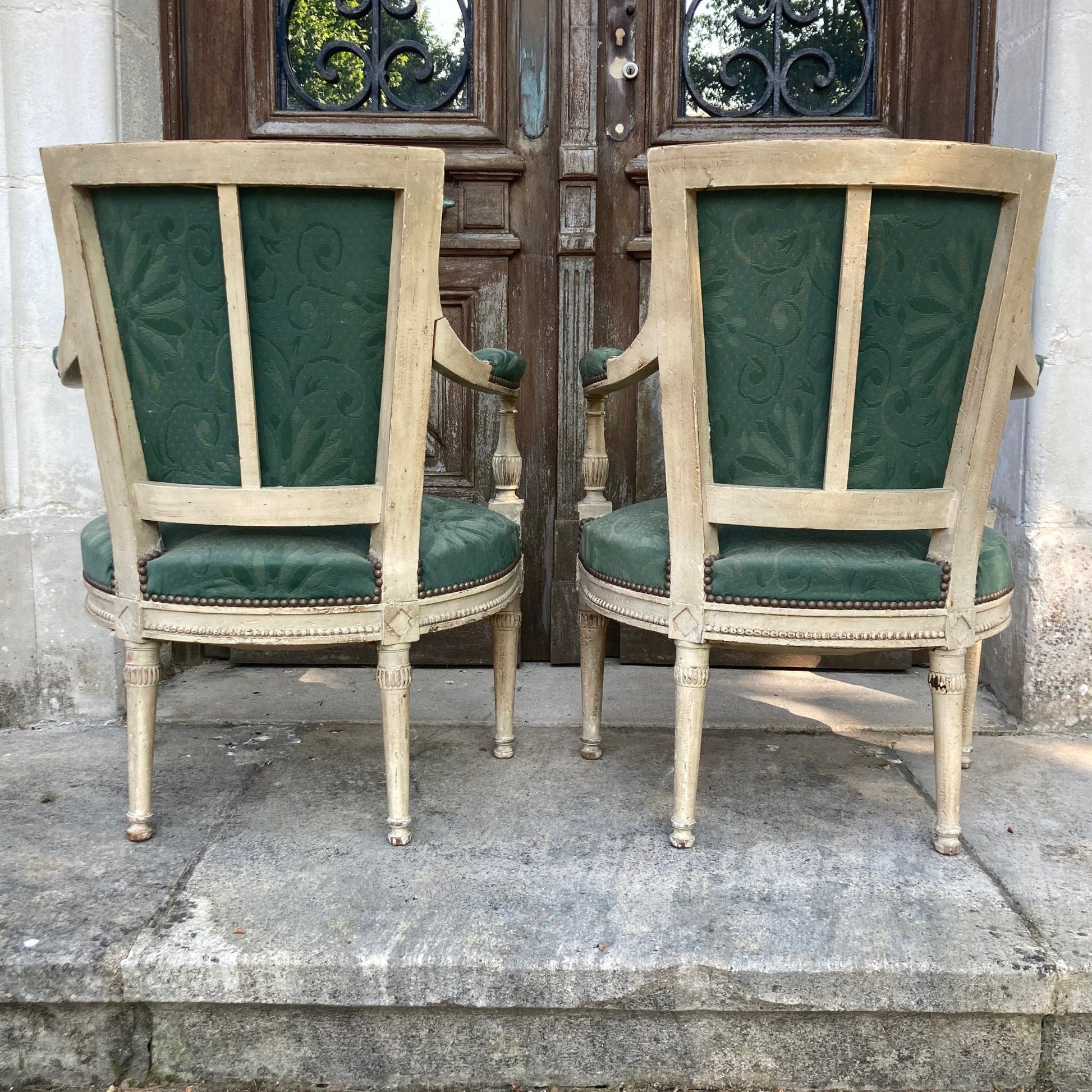 ディレクトワール様式のペアのアームチェア、グレーがかった白のラッカー仕上げのブナ材、モールディングと彫刻入り。
