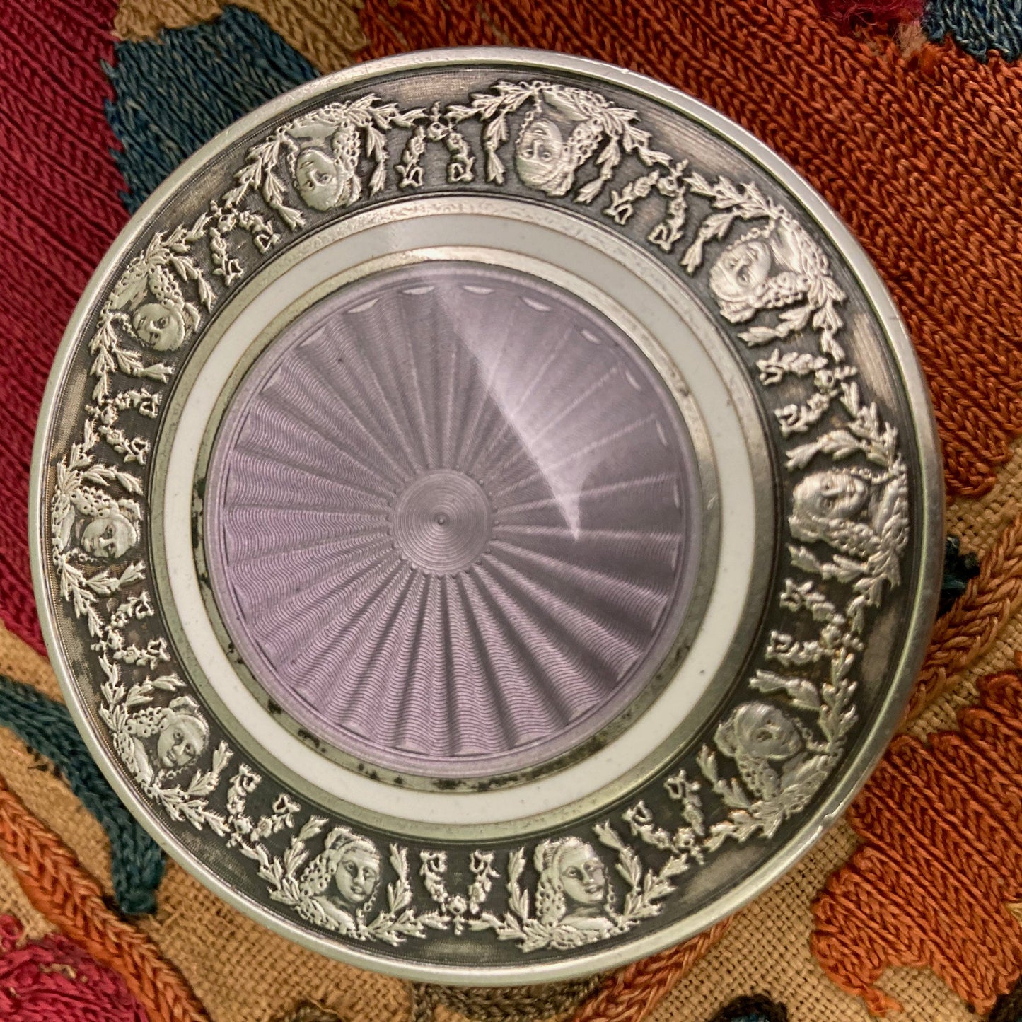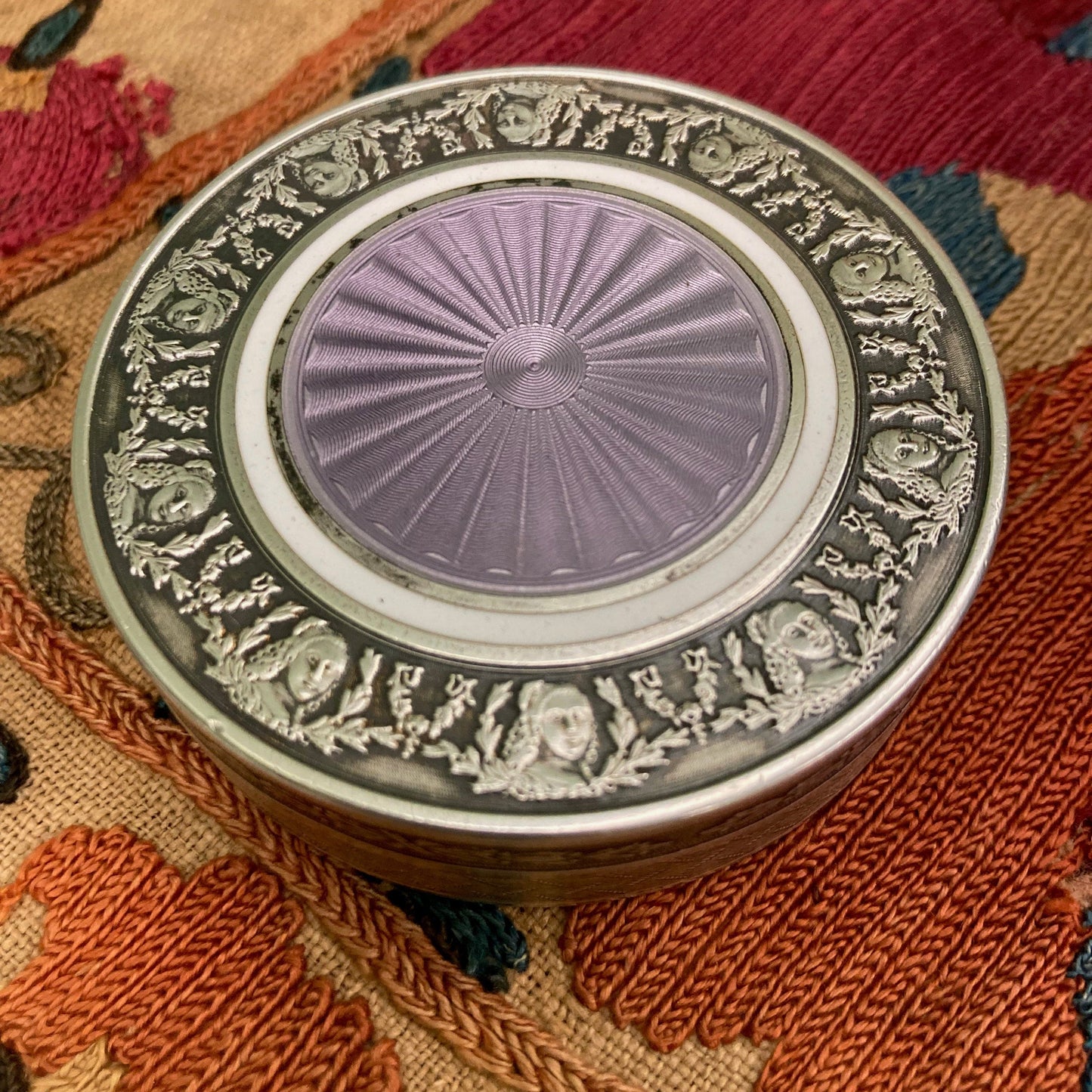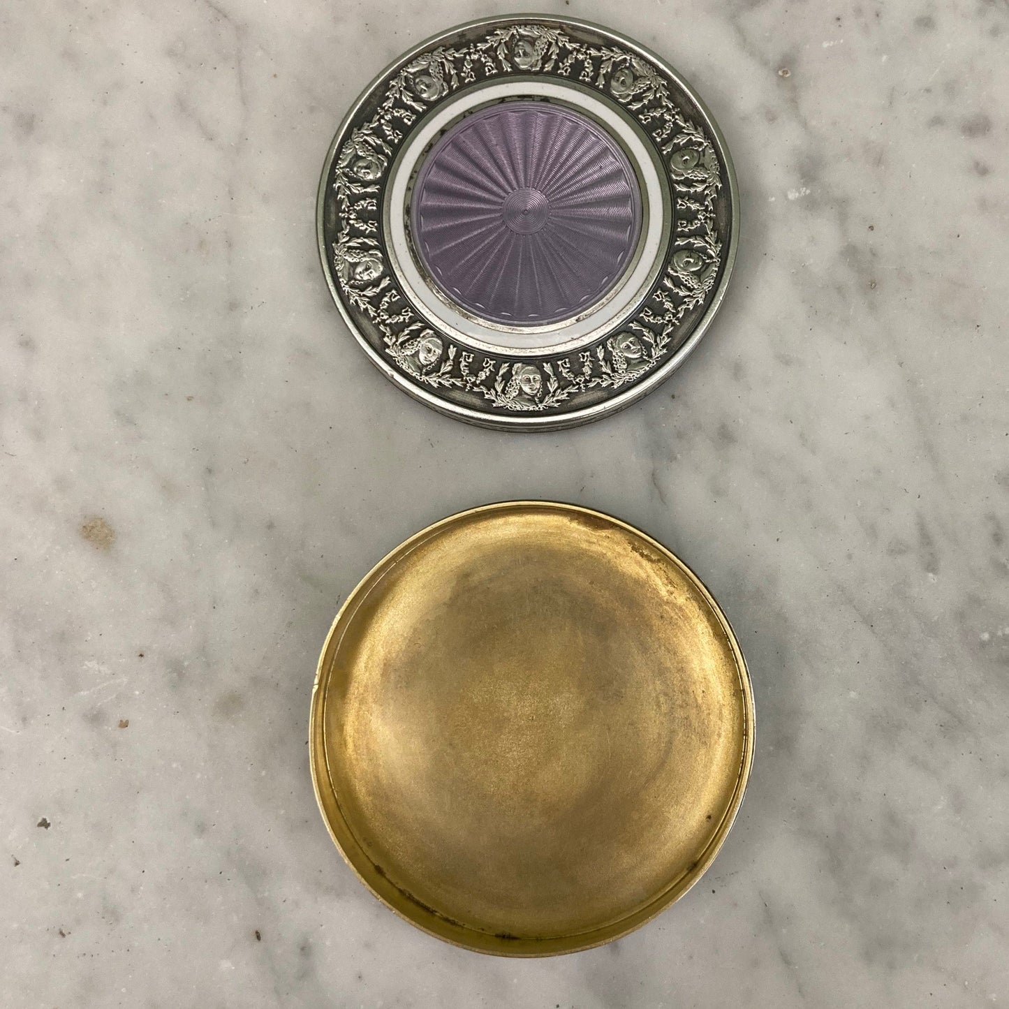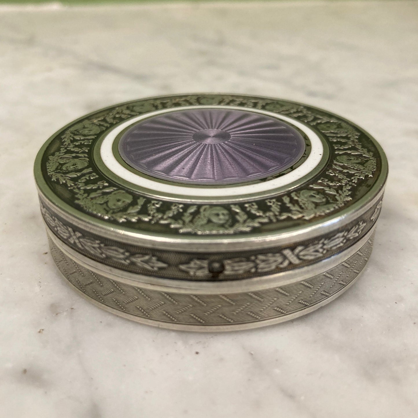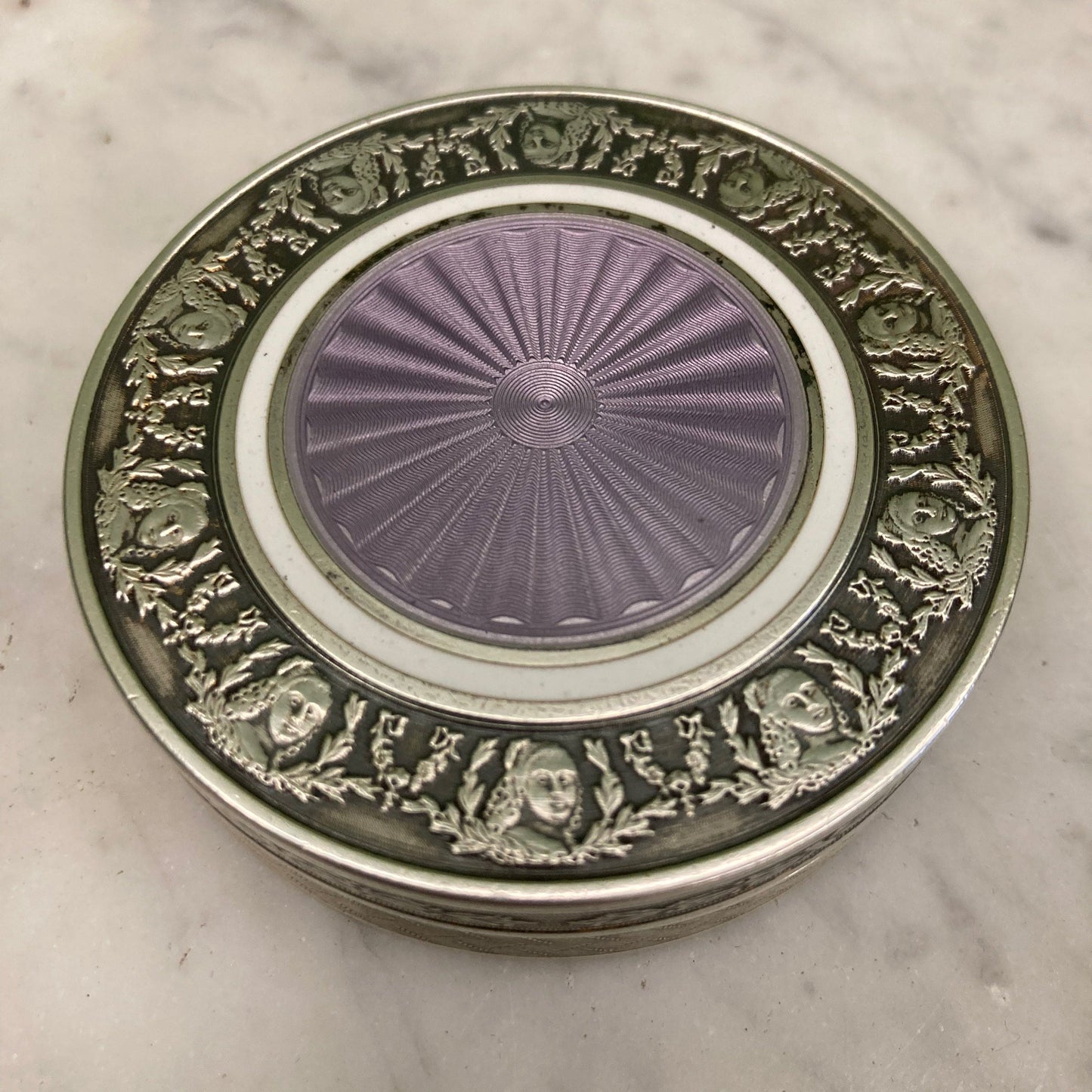 中央にバイオレットカラーのエナメルが施されたギヨシェ銀製の蓋は、無地の白いエナメルの円と、花とユリのガーランドで飾られた女性の胸像のフリーズ(セヴィニエ侯爵夫人?)で強調されています。縁は月桂樹の葉の装飾。内側は無地のヴェルメイユ仕上げです。