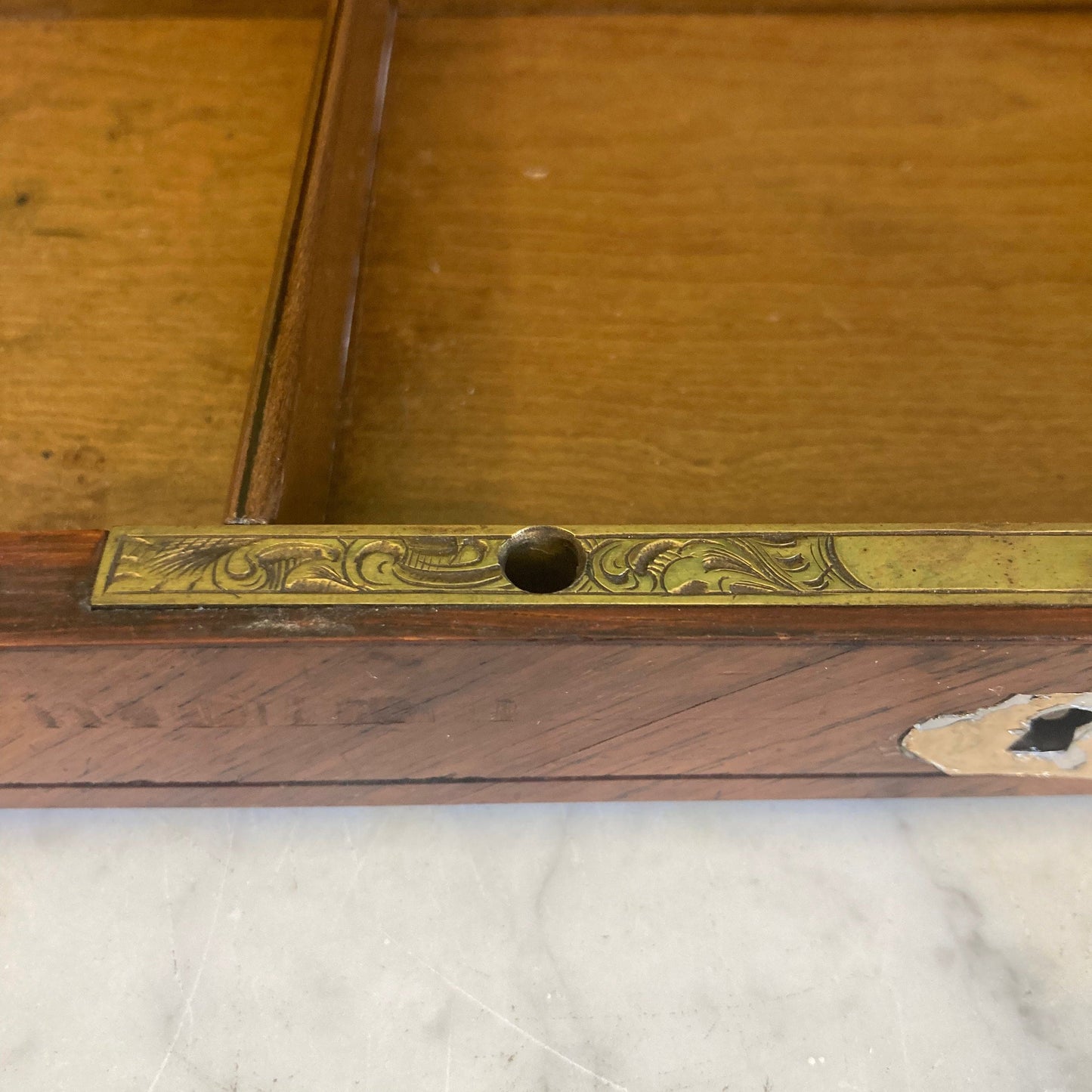 Le plateau est à décor en frisage de bois de rose, filets de laiton et médaillon central en porcelaine peinte de fleurs polychromes, pourtour doré, sur fond bleu. Encadrement de baguettes de bronze doré.