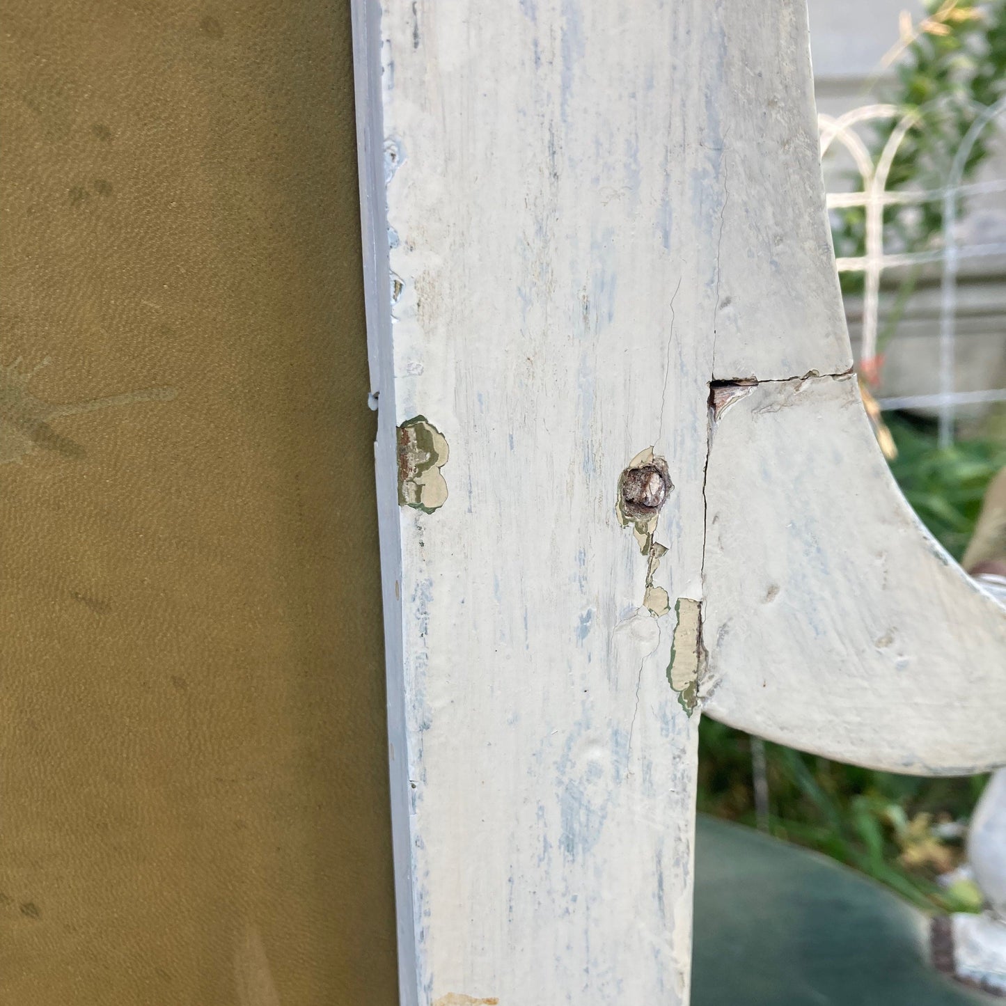 Старое кресло с белым лакированным покрытием и зелёной кожей эпохи Директории, конец 18 века.