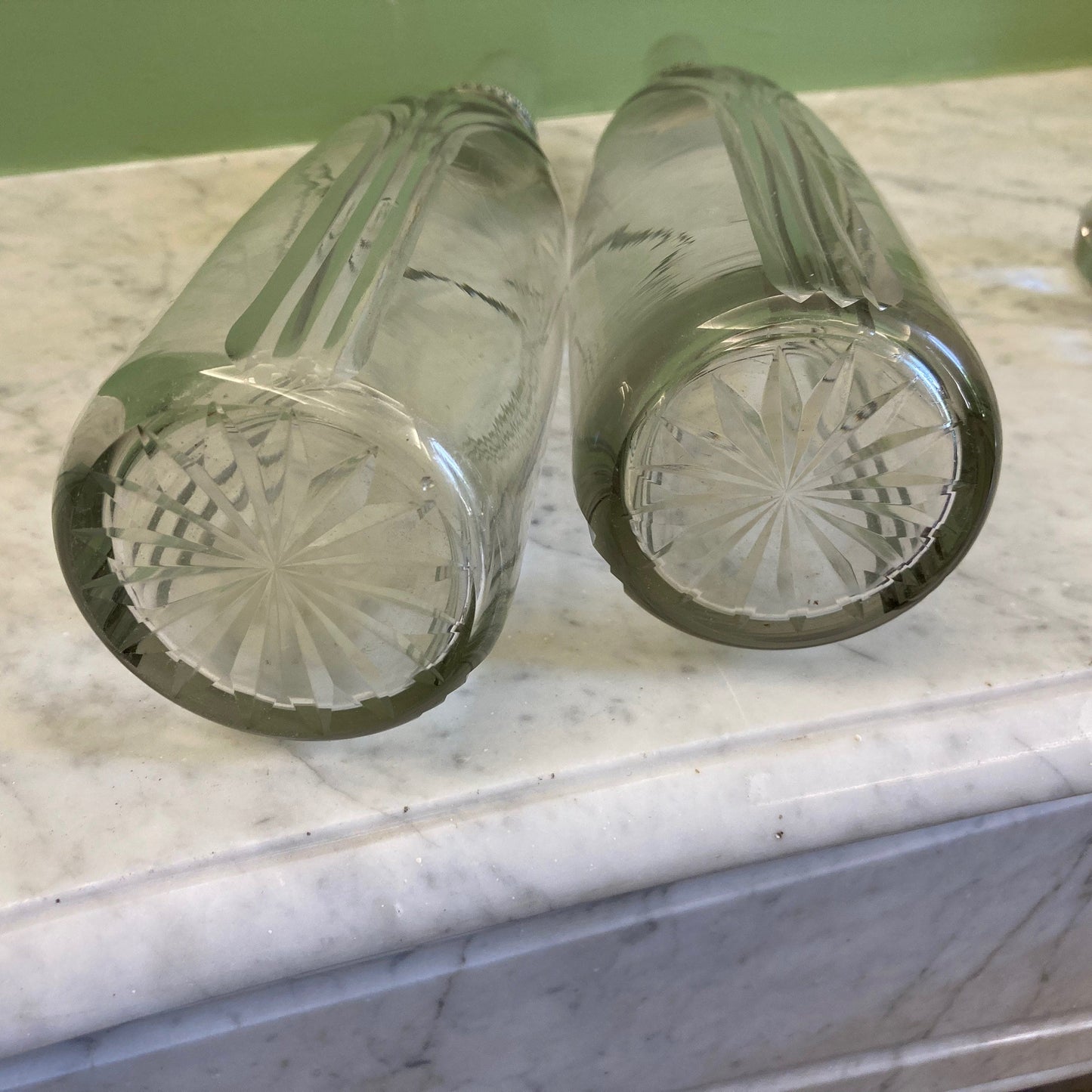 Красивый набор из двух больших хрустальных графинов с резным декором в виде снопа и звездчатым основанием.